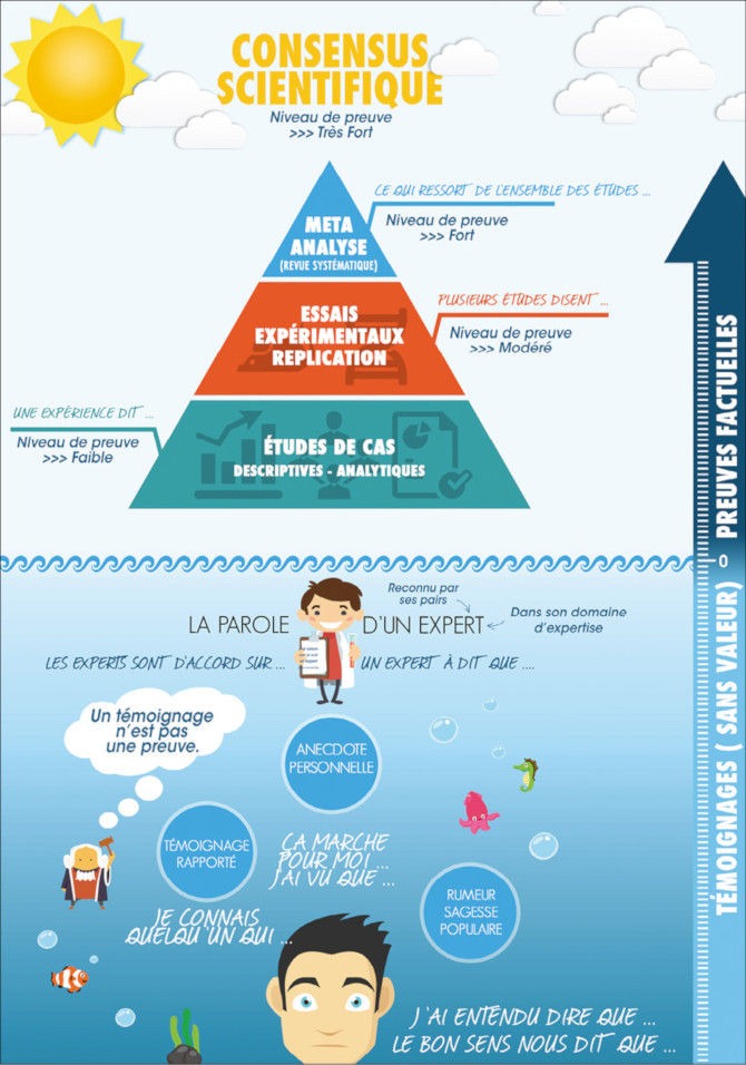 La pyramide des preuves est un modèle qui classe les différents types d'études selon leur niveau de fiabilité et de validité scientifique. Plus on monte dans la pyramide, plus le niveau de preuve est élevé.
